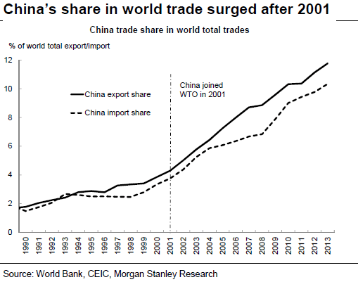 Chart showing China’s economic weight in international trade since 2001, as China joined WTO (data by World Bank, 2013)